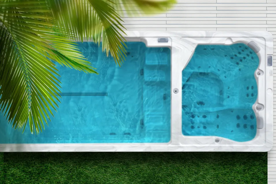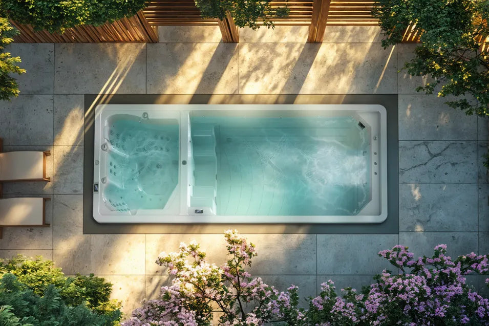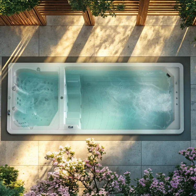 Ontdek het ultieme zwembad met twee kamers, waar hydrotherapie, fitness en verfrissing perfect samenkomen.