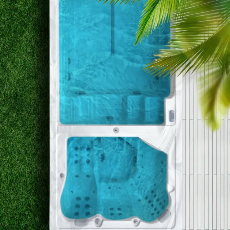 Dankzij het ontwerp met twee kamers kunt u genieten van gepersonaliseerde watertemperaturen en speciale ruimtes voor zowel ontspanning als lichaamsbeweging – echt het beste van twee werelden.