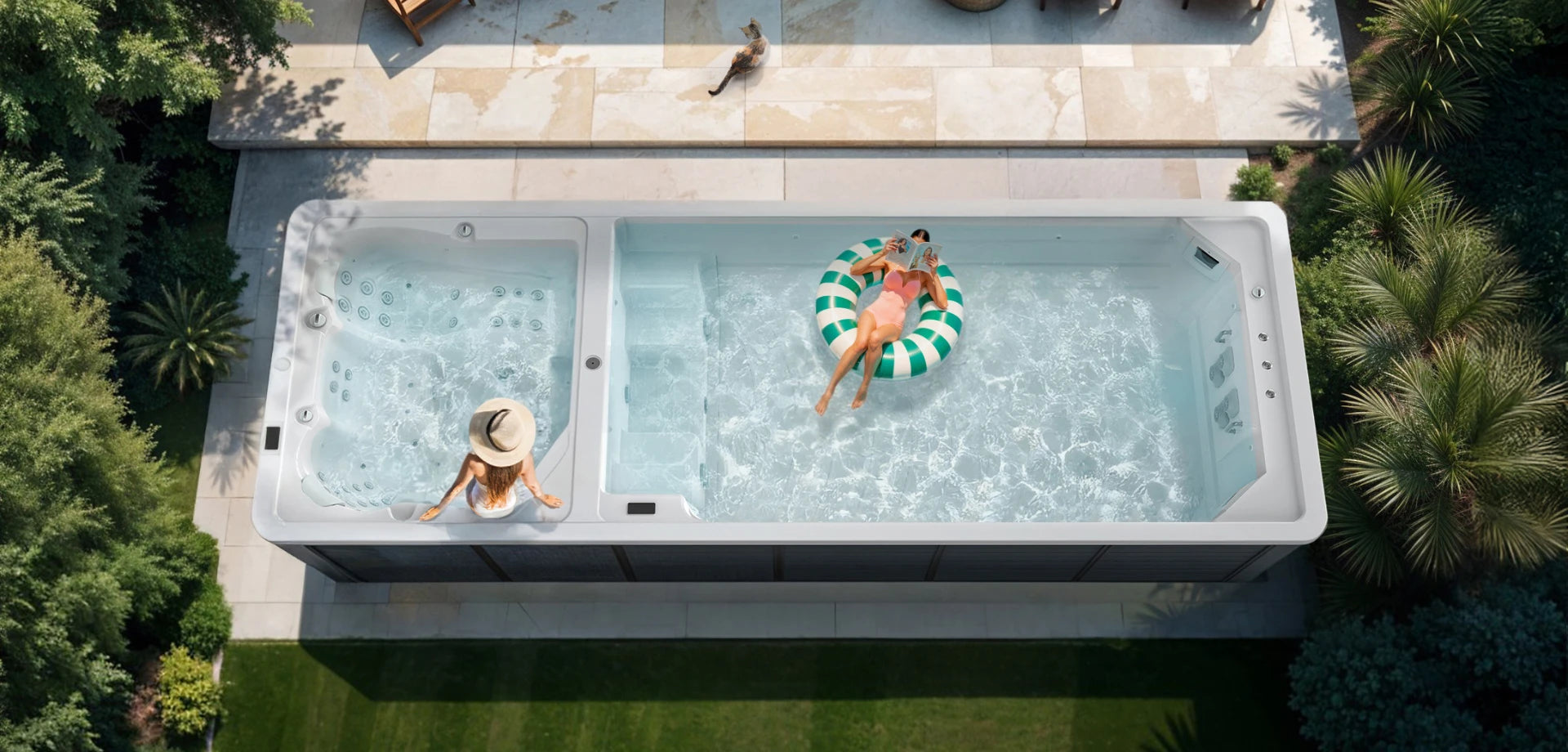 Easy Life 4,4 extra diepe zwemspa,ontworpen voor lichaamsbeweging, ontspanning en plezier. Met onze extra diepe Easy Life Zwemspa kun je eindeloos zwemmen en tot rust komen met kalmerende hydrotherapie - en dat allemaal in het comfort van je eigen tuin.