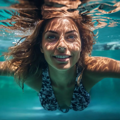 Vrouw onder water bij het zwembad